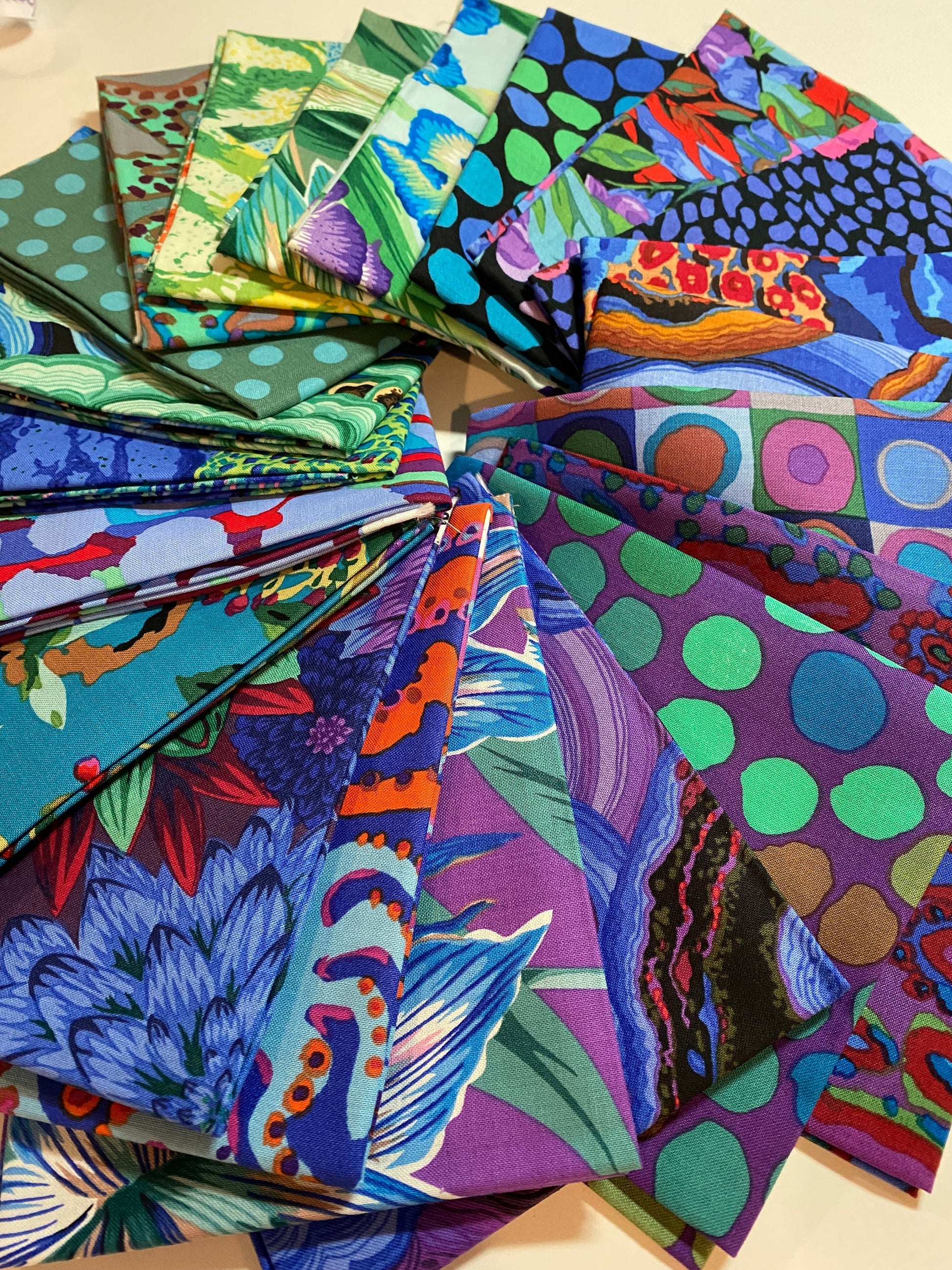 ITEM— Fat Quarter Bundle 21 Pieces Cool Color-way Kaffe Fassett Collection Colors in Blues, Purples, Greens with splashes of cool colors to cool you down.
